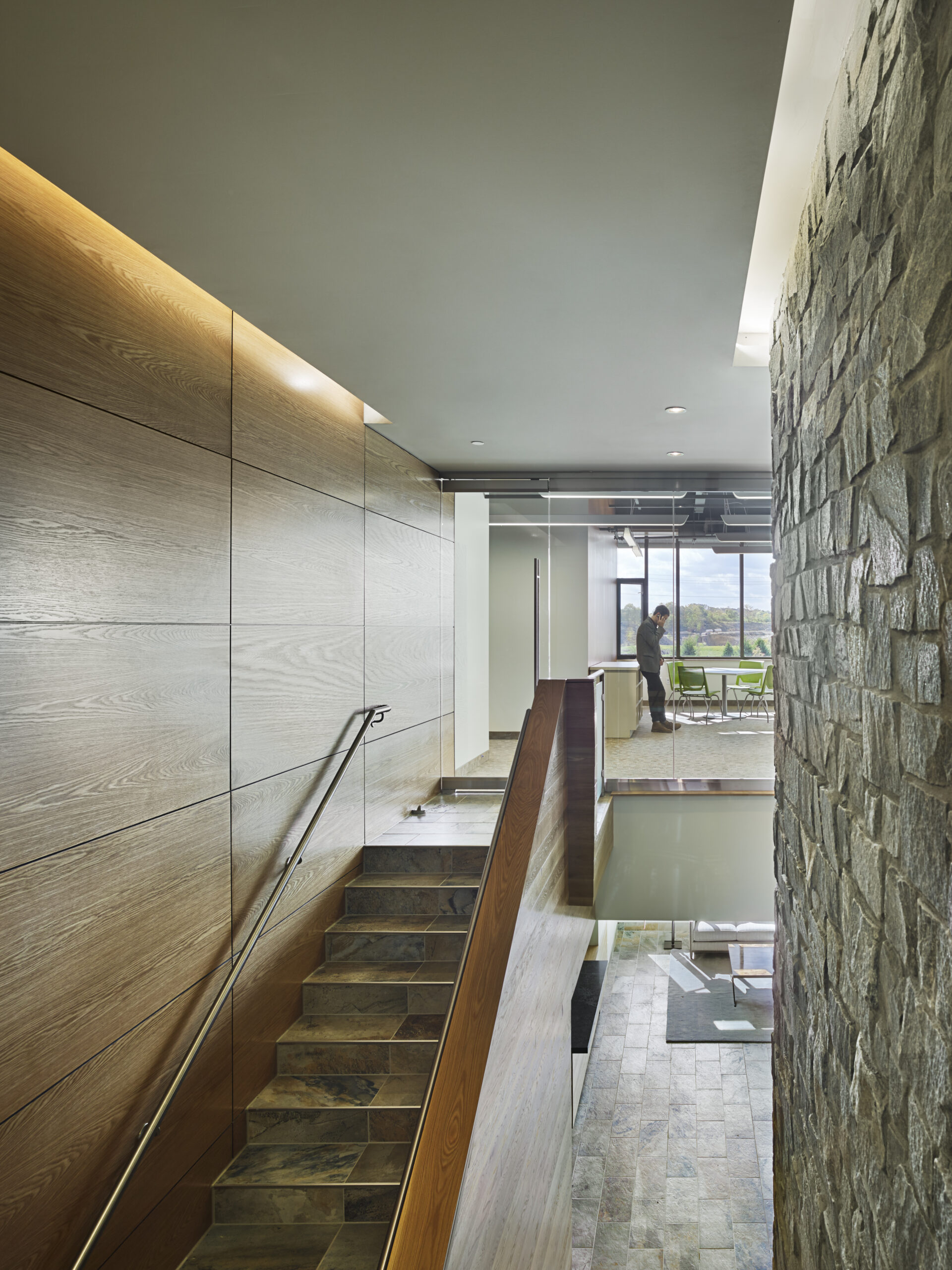 Construction of a new four story, 40,000 SF office building for the DePaul Family of Companies located in Flourtown, PA. The three stories above grade provide high end office areas with exposed structural elements which create an open and modern aesthetic. The exposed structure rises 35′ above the top floor and is illuminated through clerestory windows and light wells. The entry lobby is a convergence of wood panels, stone flooring, plaster archways, butt-glazing, and exposed steel which introduces visitors to the modern aesthetic of the entire building. Project included a full below grade basement for meeting rooms, storage, and back of house functions.