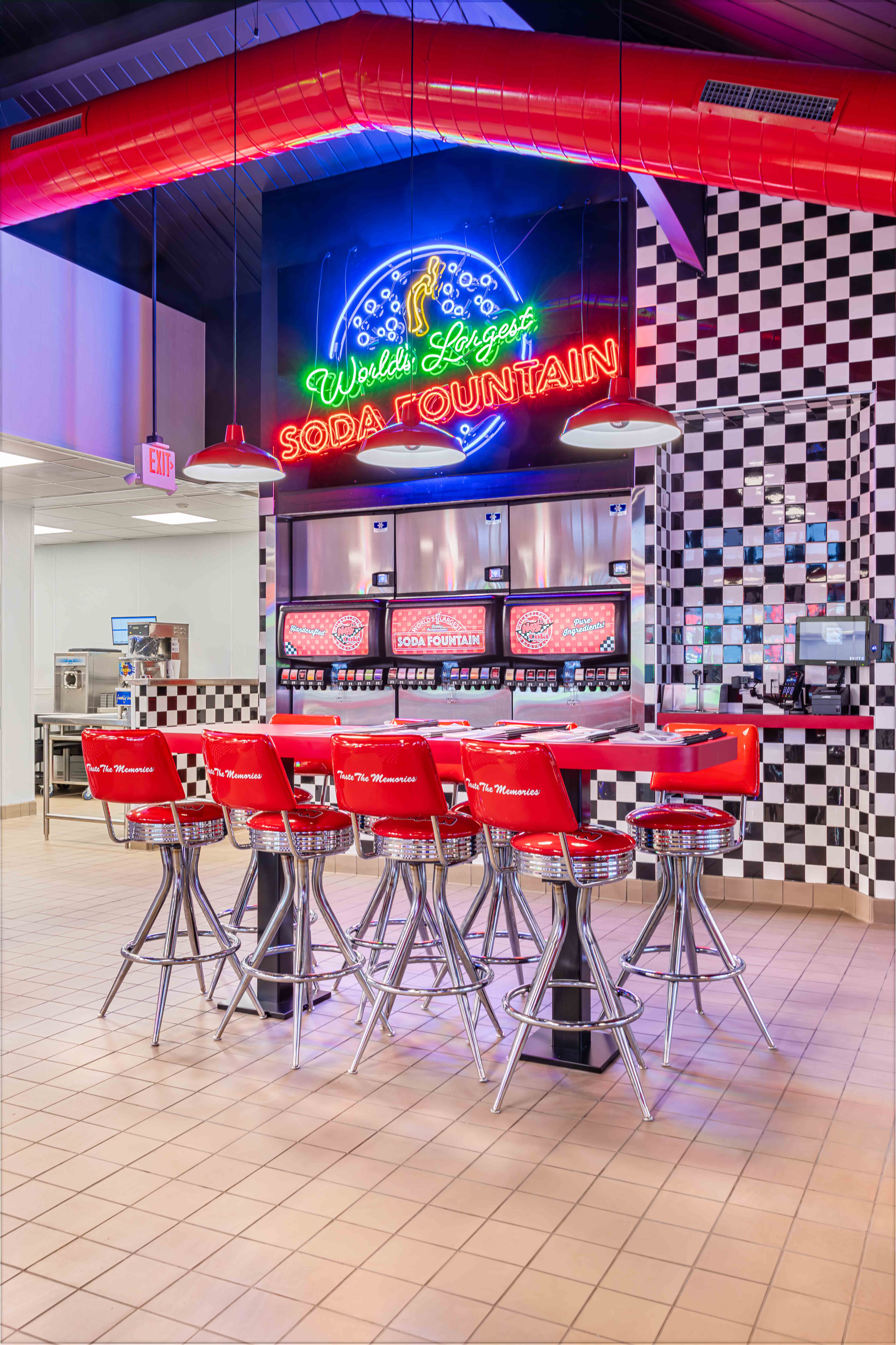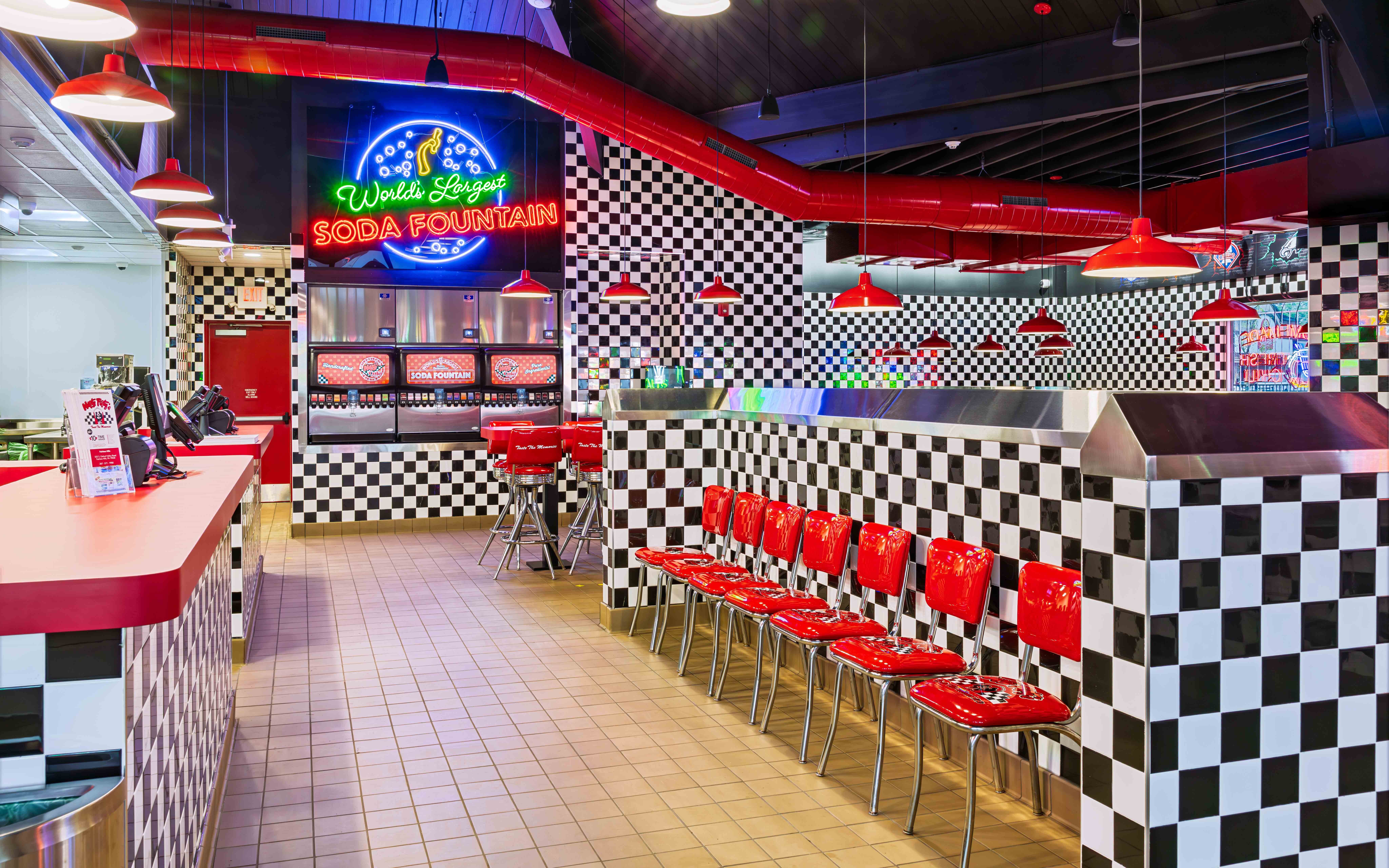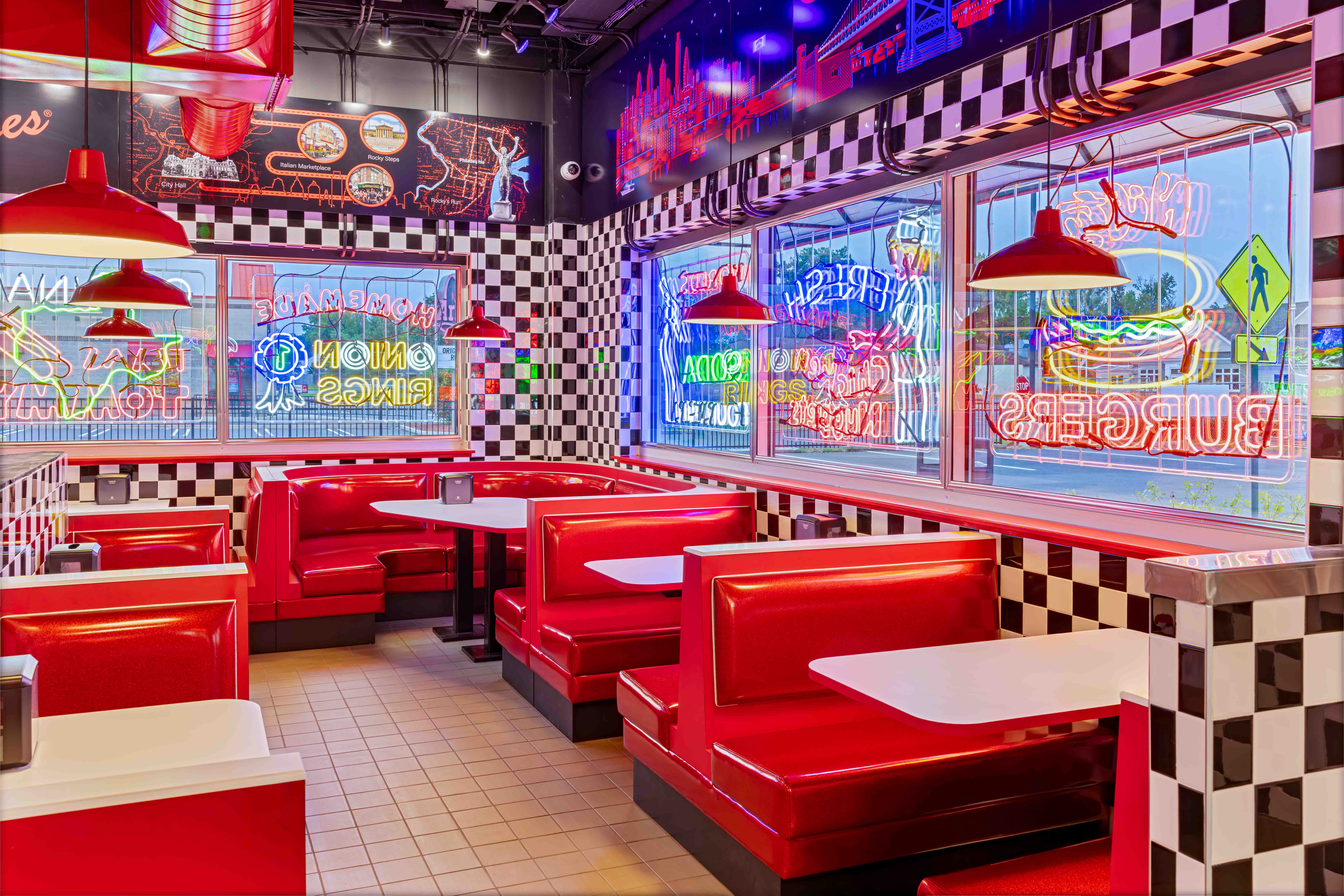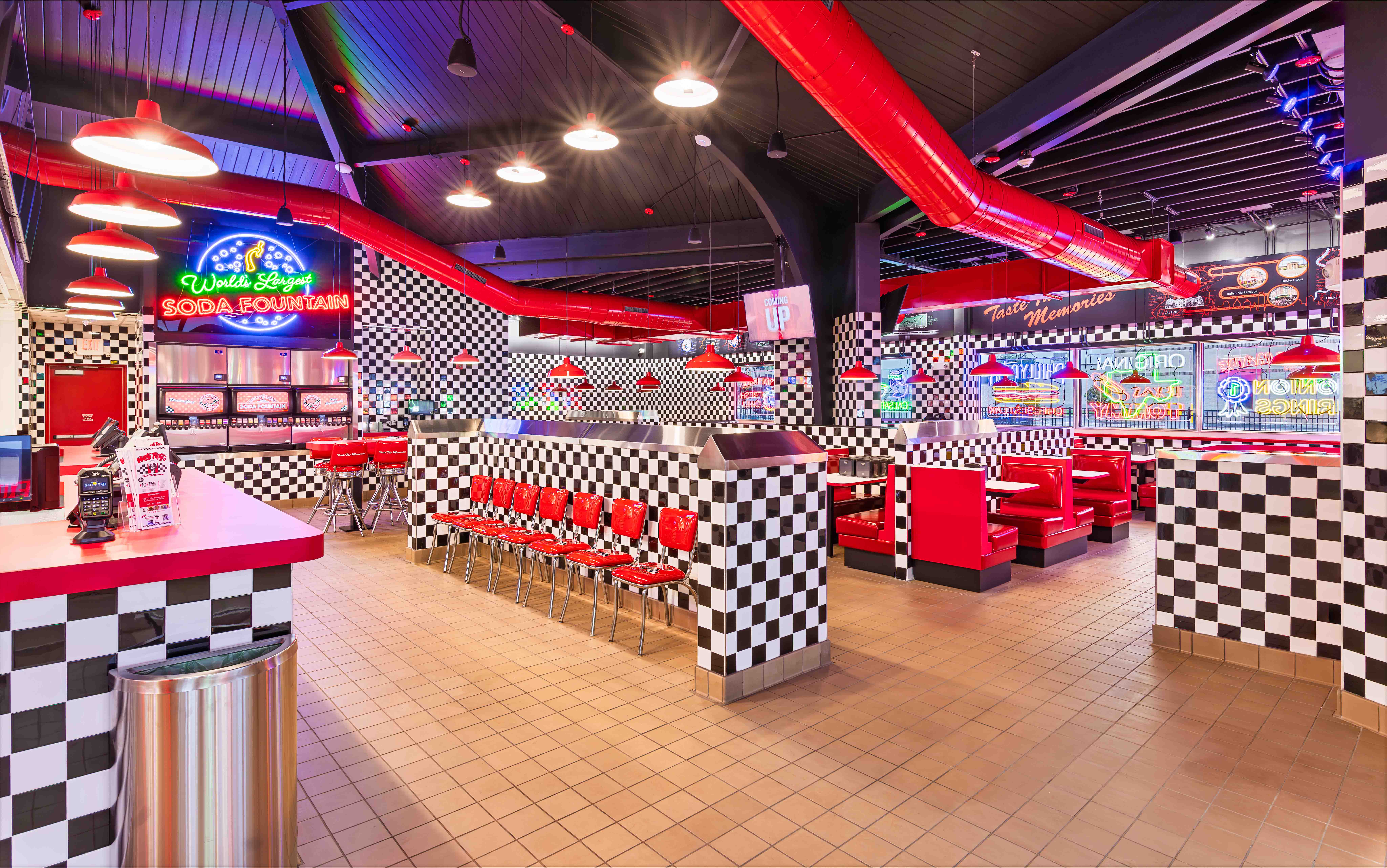 Exterior finishes feature EIFS, a checkered tile wainscot, stainless steel panels, new windows, and a glass vestibule. The interior showcases a full commercial kitchen, vaulted ceilings, tile flooring, checkered tile walls, neon graphics, and custom booth seating with vinyl upholstery — all designed to capture the nostalgic charm of a classic 1950s diner.